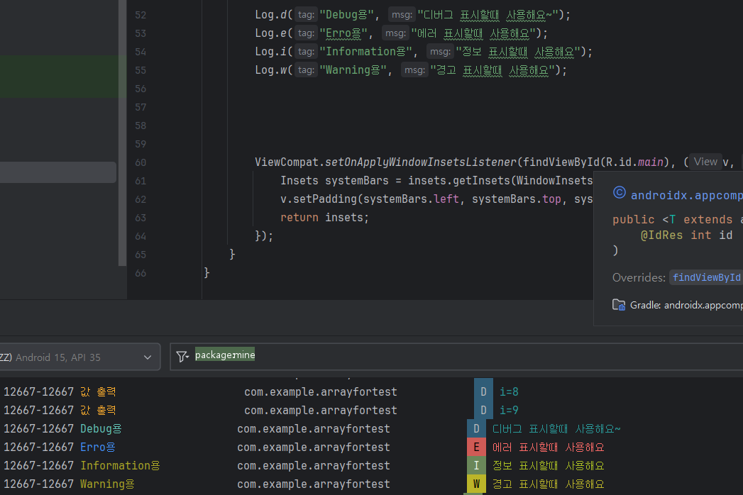 Log.d()이외에도 Log.i(), Log.w(), Log.e()등 여러가지를 사용할수 있습니다.