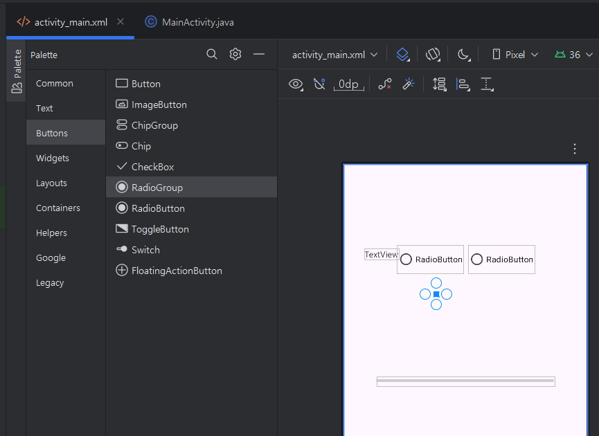 위와같이 TextView 1개, RadioButton 2개, RadioGroup 1개를 화면에 갖다놓겠습니다.