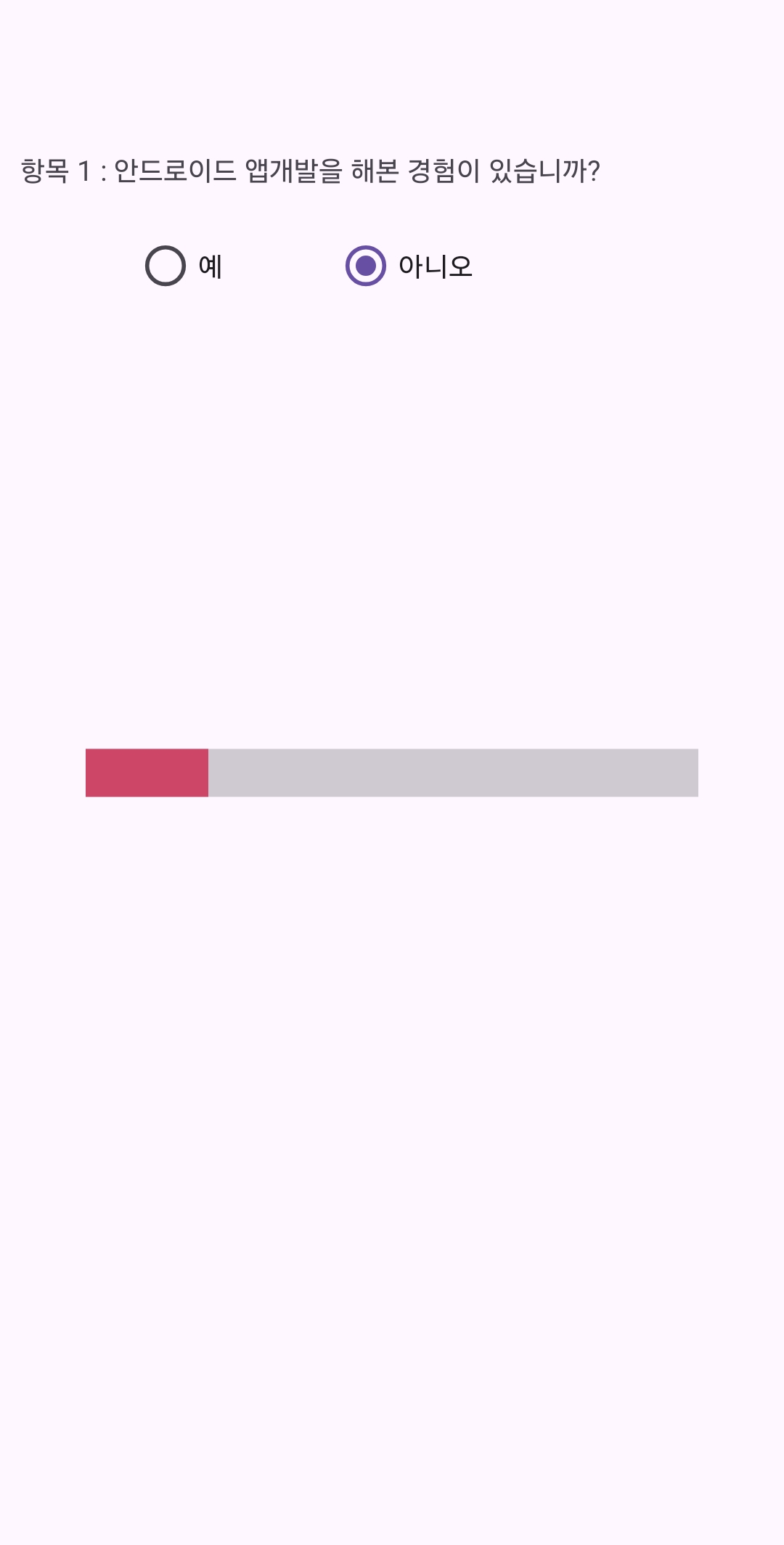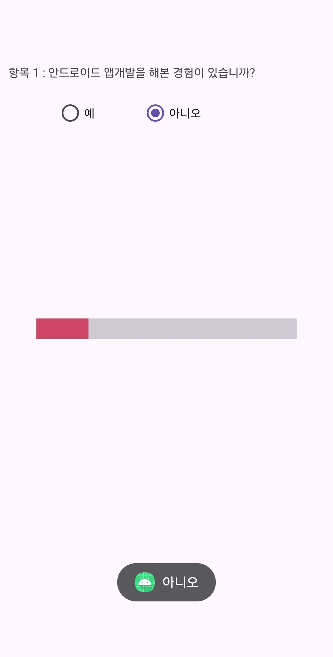 android:text="항목 1 : 안드로이드 앱개발을 해본 경험이 있습니까?"