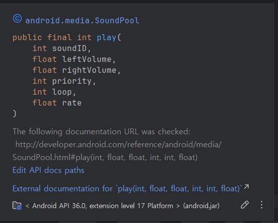 SoundPool.play()는 짧은 효과음을 재생하기 위한 함수인데