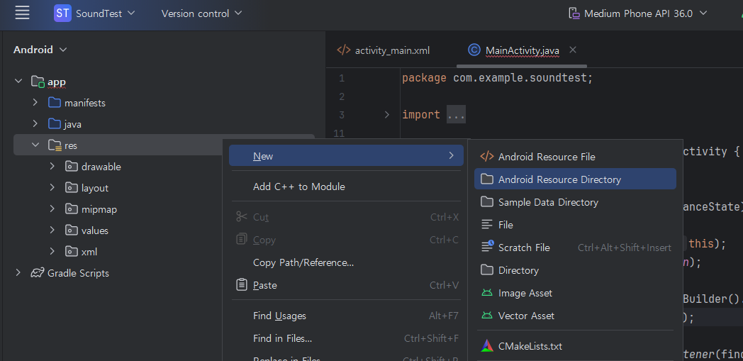 프로젝트 명은 SoundTest라고 하겠습니다.