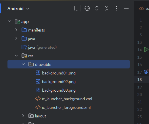 app->res->drawable 폴더 밑에 배경이미지 3개가 잘 등록이 되었습니다.