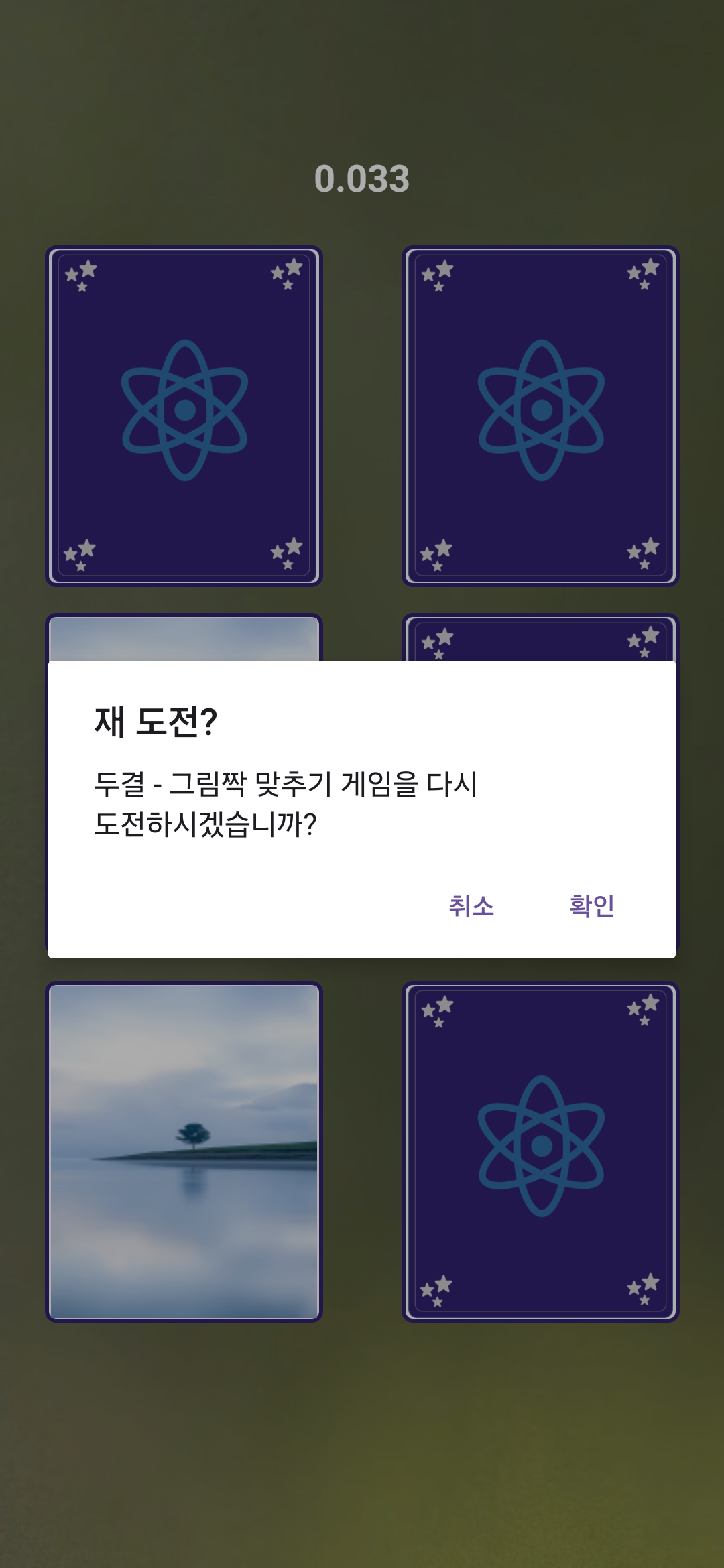 네, 위와같이 30초 안에 다 못맞추면 "재도전" Dialog 상자가 표시가 됩니다. ^^